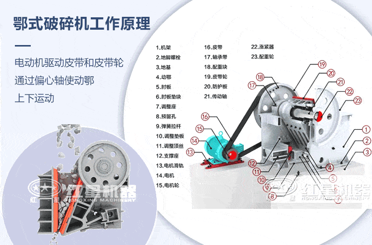 電動機驅(qū)動皮帶和皮帶輪,通過偏心軸使動鄂上下運動,當(dāng)動鄂上升時肘板與動鄂間夾角變大,從而推動動鄂板向固定鄂板接近,與其同時物料被壓碎或劈碎,達(dá)到破碎的目的;當(dāng)動鄂下行時,肘板與動鄂夾角變小,動鄂板在拉桿彈簧的作用下,離開固定鄂板,此時已破碎物料從破碎腔下口排出。隨著電動機連續(xù)轉(zhuǎn)動而破碎機動鄂作周期運動壓碎和排泄物料,實現(xiàn)鄂式破碎機的批量生產(chǎn)。