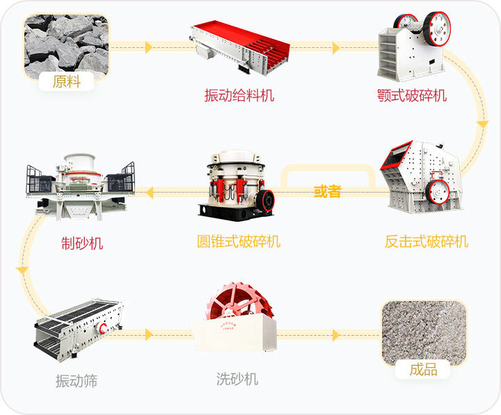 設(shè)備配置:顎式破碎機(jī)、反擊式破碎機(jī)或液壓圓錐破,制砂機(jī),洗砂機(jī),圓振動篩等設(shè)備